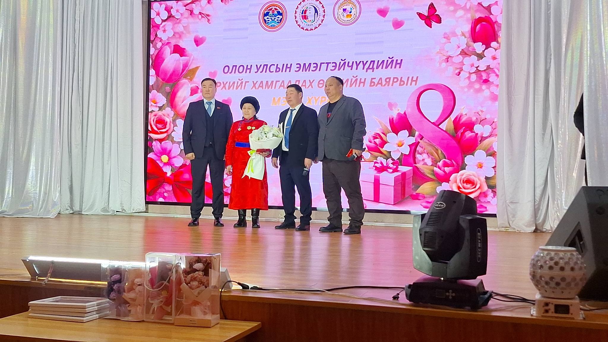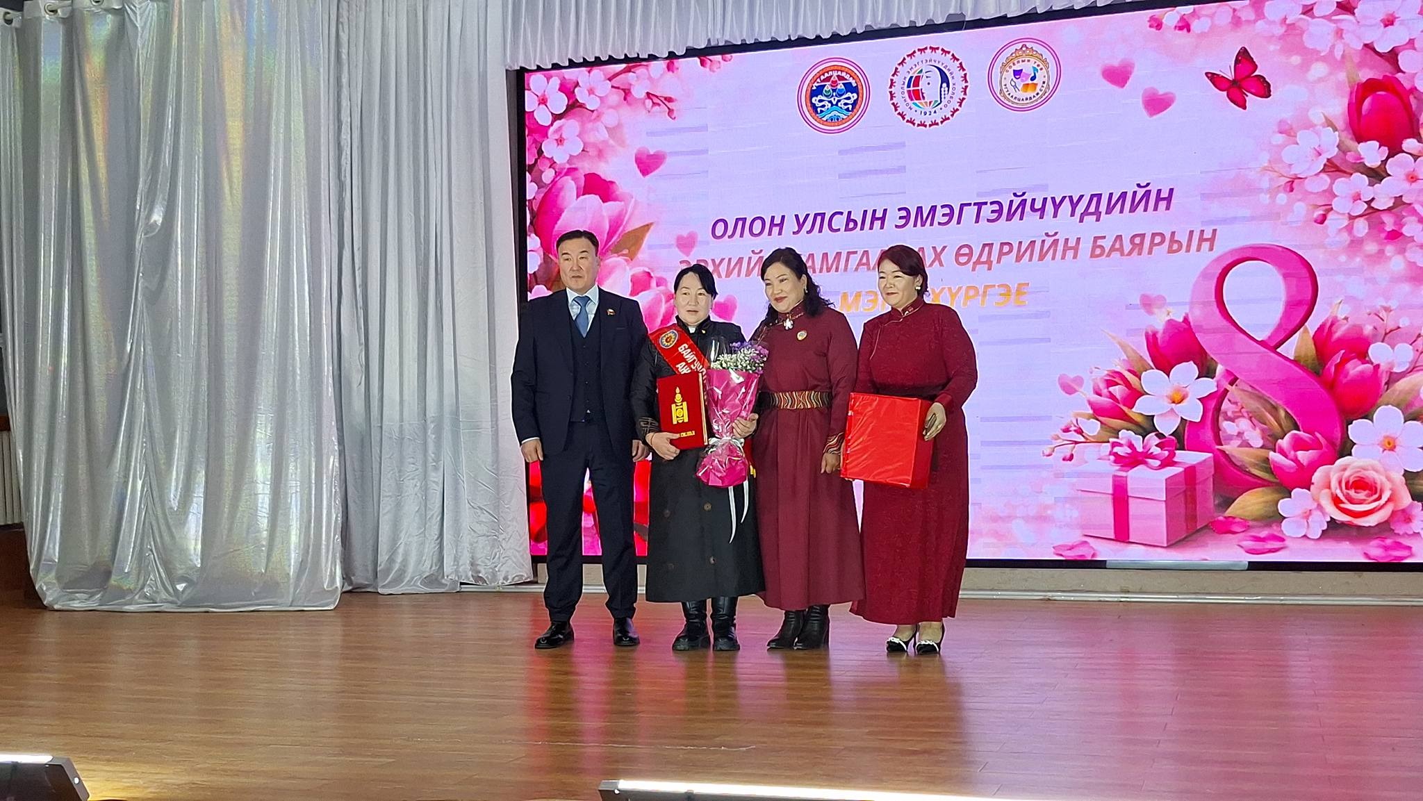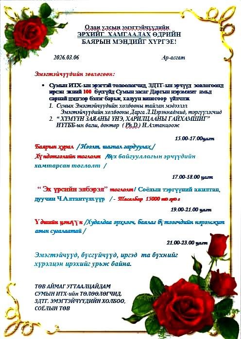 Хамтран ажиллаж, дэмжиж тусалсан Сумын Засаг дарга, ЗДТГ-ын Дарга, ИХ-ын Дарга, ИХ-ын Төлөөлөгчид, ЗДТГ, Сургууль, Цэцэрлэг, Соёлын төв, Эрүүл мэндийн төв, Цаг уур, Төрийн банк, Хаан банк, Петровис ШТС, Эрчим хүчний Удирдлага, Хамт олон, Худалдаа үйлчилгээ эрхлэгчид, Жижиг дунд үйлдвэрлэл эрхлэгчид, Сумын ИХ-ийн Төлөөлөгч, Сумын ЭХ-ны тэргүүлэгч Д.Сумьяа, Сургуулийн номын санч сумын ЭХ-ны салбар зөвлөлийн тэргүүлэгч С.Чулуунцэцэг, Сумын мянгат малчин А.Мөнхбаатар, "Yaru flora" mini дэлгүүр, Нийт бүсгүйчүүдэд зохион байгуулалттайгаар үйлчилгээ үзүүлсэн Сумын Засаг Дарга, ЗДТГ-ын Дарга, ЗДТГ-ын эрчүүд, Иргэдийн хурлийн Дарга, Эрэгтэй төлөөлөгчид, Сумынхаа ЭХ-ны тэргүүлэгчид та нартаа баярлаж талархсанаа нийт эмэгтэйчүүдийнхээ өмнөөс илэрхийлье.